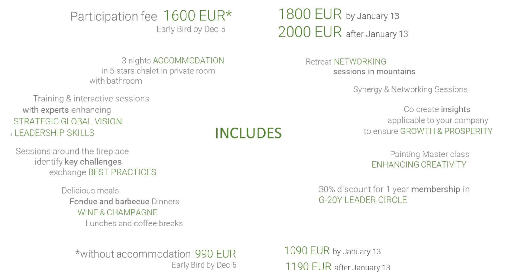 3 days among 20 owners in a luxury chalet: synergy and networking sessions, exclusive training and interactive sessions with extraordinary speakers, atmosphere of trust and friendship, delicious meals & wine experience.