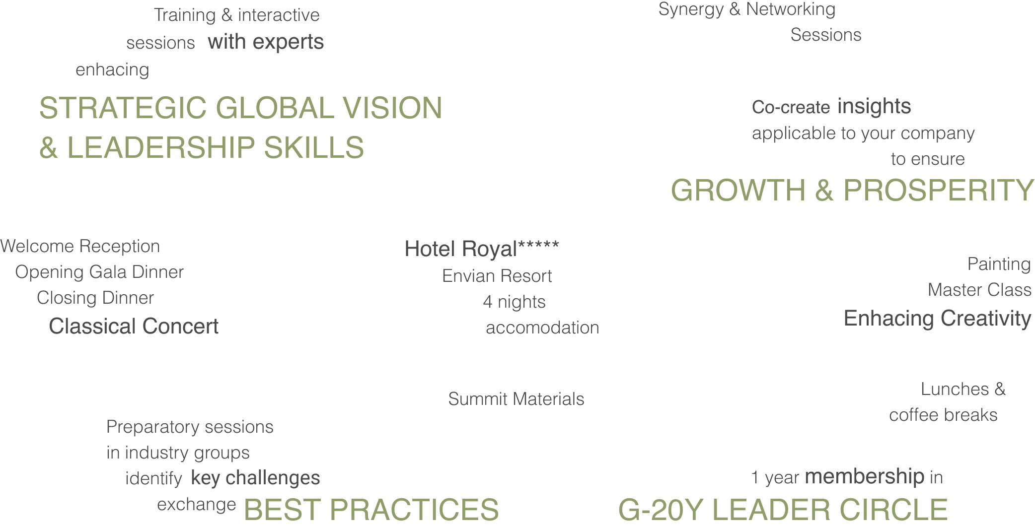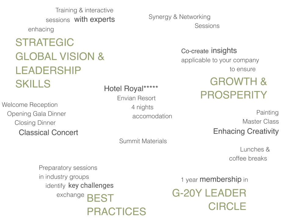 The G-20Y Summit stands as a distinguished program for transformative leadership, specifically tailored for senior executives from globally renowned companies and business owners. Over the course of 15 years, we have successfully convened more than 1000 top executives. Our participants hail from 400 of the world's largest companies spanning across 5 continents. We proudly operate as an exclusive leader circle, bringing together influential figures in business, government, and entrepreneurship.